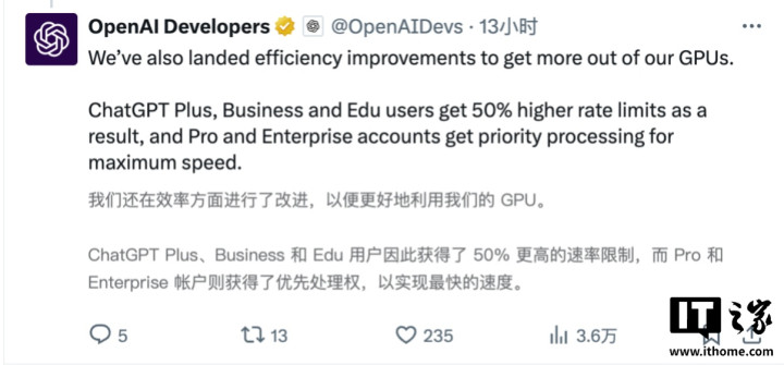 借助GPU效率提升,ChatGPTPlus、Business和Edu用户的速率上限将能够提高50%,ChatGPTPro与Enterprise用户则享有优先调度以获得更快响应。