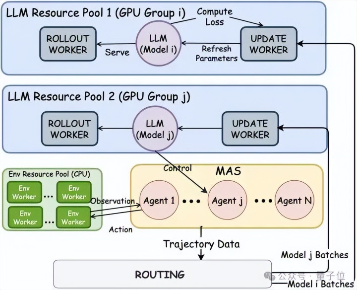专属模型模式下,系统可以配置多个独立的模型资源池(如图中的池i和池j)。路由模块会将智能体i的数据批次仅发送给池i的更新单元,专门更新模型i;同时将智能体j的数据批次发送给池j的更新单元,独立更新模型j。