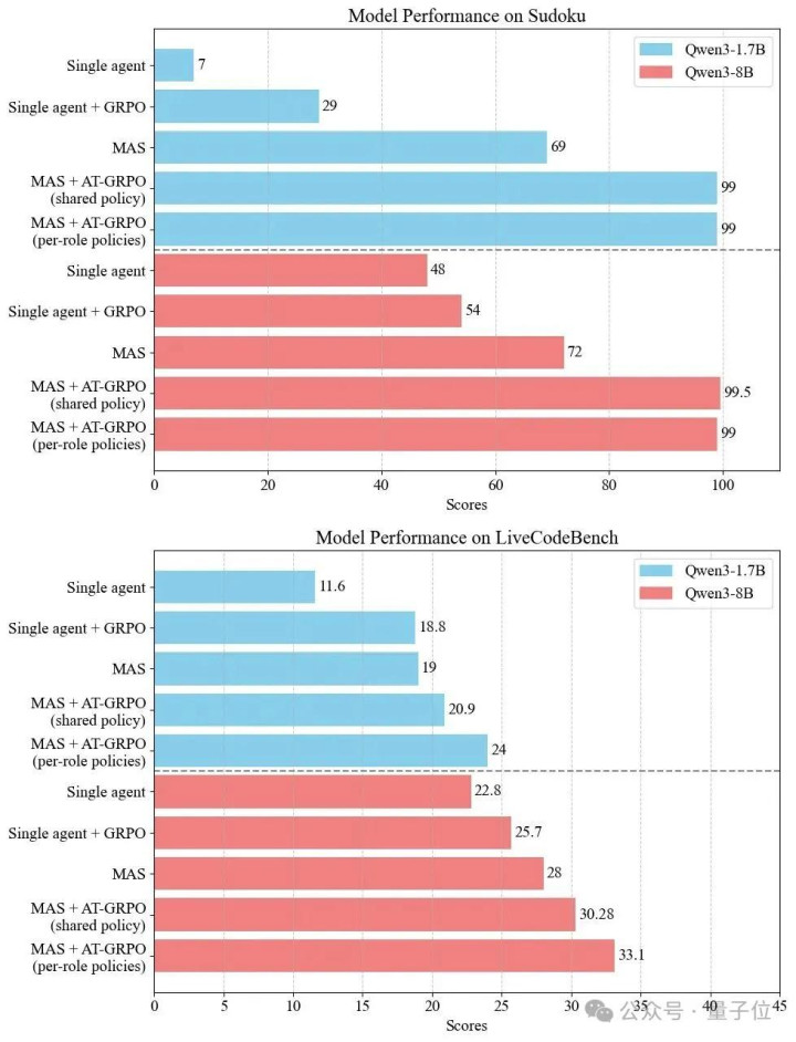 在推箱子这种长规划任务中,通过AT-GRPO训练,两个agent都得到了强化,任务性能从14%提升至96%。