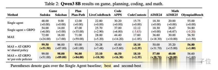只在单智能体(SA)里训练,收益有限:把规划/工具等子角色各自放在 SA 环境里训练,单看各自指标会从 5.0% 提到11.0%/14.5%,但放回MAS联合作业仅到16.0%。